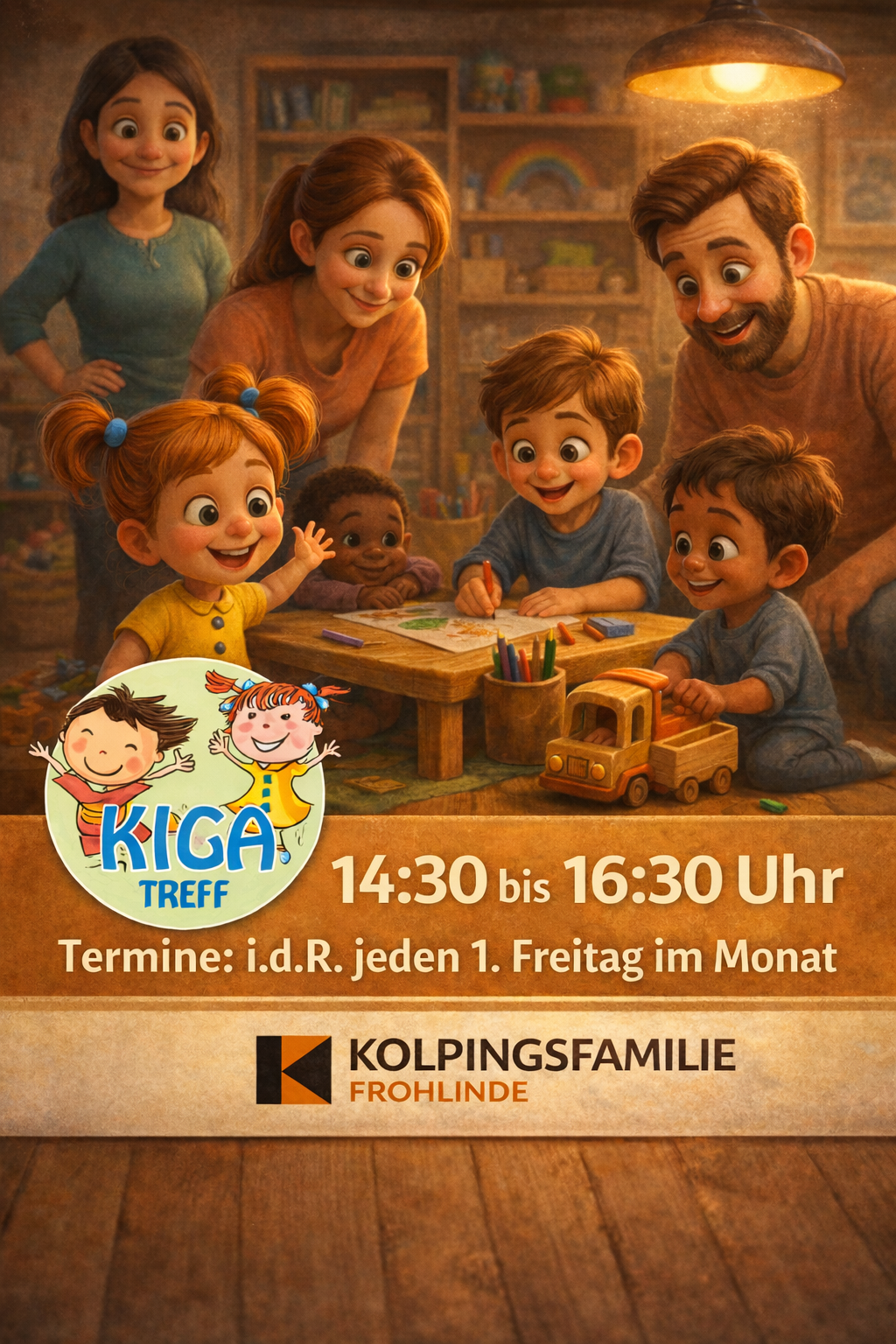 KiGa-Treff Termin Details Dieser Termin läuft vom 5 September 2025 bis 3 Juli 2026 und findet das nächste Mal am 6. Februar 2026 14:30 statt. Ort: Turnraum Kindergarten (Eingang Pfarrsaal), Hubertusstr. 13, 44577 Castrop-Rauxel Kommende Daten: 6. Februar 2026 14:30 – 16:306. März 2026 14:30 – 16:308. Mai 2026 14:30 – 16:303. Juli 2026 14:30 – 16:30 Wir laden alle Kindergartenkinder ab 3 Jahren zusammen mit ihren Eltern zu Spiel, Spaß und Unterhaltung in den Pfarrsaal sein.