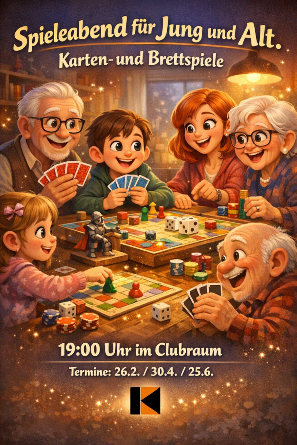 Spieleabend für Jung und Alt Termin Details Dieser Termin läuft vom 26 Februar 2026 bis 25 Juni 2026 und findet das nächste Mal am 30. April 2026 19:00 statt. Ort: Clubraum (Pfarrsaal, Eingang Keller), Hubertusstr. 13, 44577 Castrop-Rauxel Kommende Daten: 30. April 2026 19:00 – 21:0025. Juni 2026 19:00 – 21:00 Spaß und Unterhaltung bei Karten- und Brettspielen im Clubraum. Und natürlich steht der Kicker für alle Tischfußballer bereit.