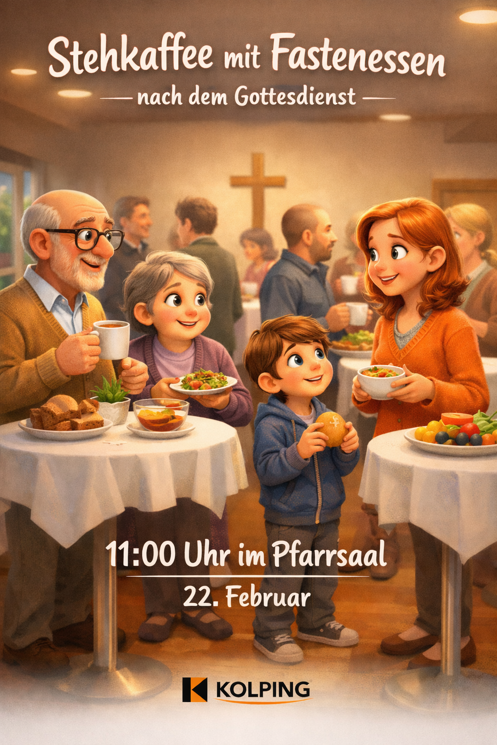 Stehkaffee mit Fastenessen Termin Details Datum: 22. Februar 2026 11:00 – 13:00 Ort: Pfarrsaal, Hubertusstr. 13, 44577 Castrop-Rauxel Herzliche Einladung direkt nach dem Gottesdienst in den Pfarrsaal.